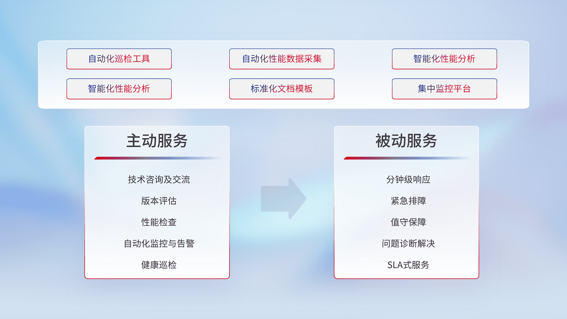 智能化工具和标准化文档,,,保障服务质量,,,,提供主动服务(包含技术咨询、、版本评估、、、、性能检查、、、、自动化监控与告警、、、、健康巡检)和被动服务包含(分钟级响应、、、、紧急排障、、、值守保障、、、问题诊断解决、、、SLA服务)。。